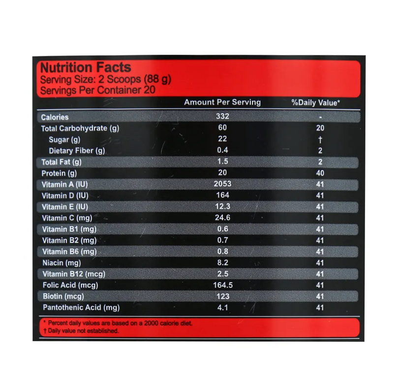 پروتئین غلیظ شده آب پنیر، پروتئین غلیظ شده شیر، کازئینات سدیم، پودر سفیده تخم مرغ، مالتودکسترین، ساکارز، پودر عصاره مالت، مجموعه ویتامینها، مخلوط آنزیمی، گوارگام، طعم دهندههای مجاز خوراکی
